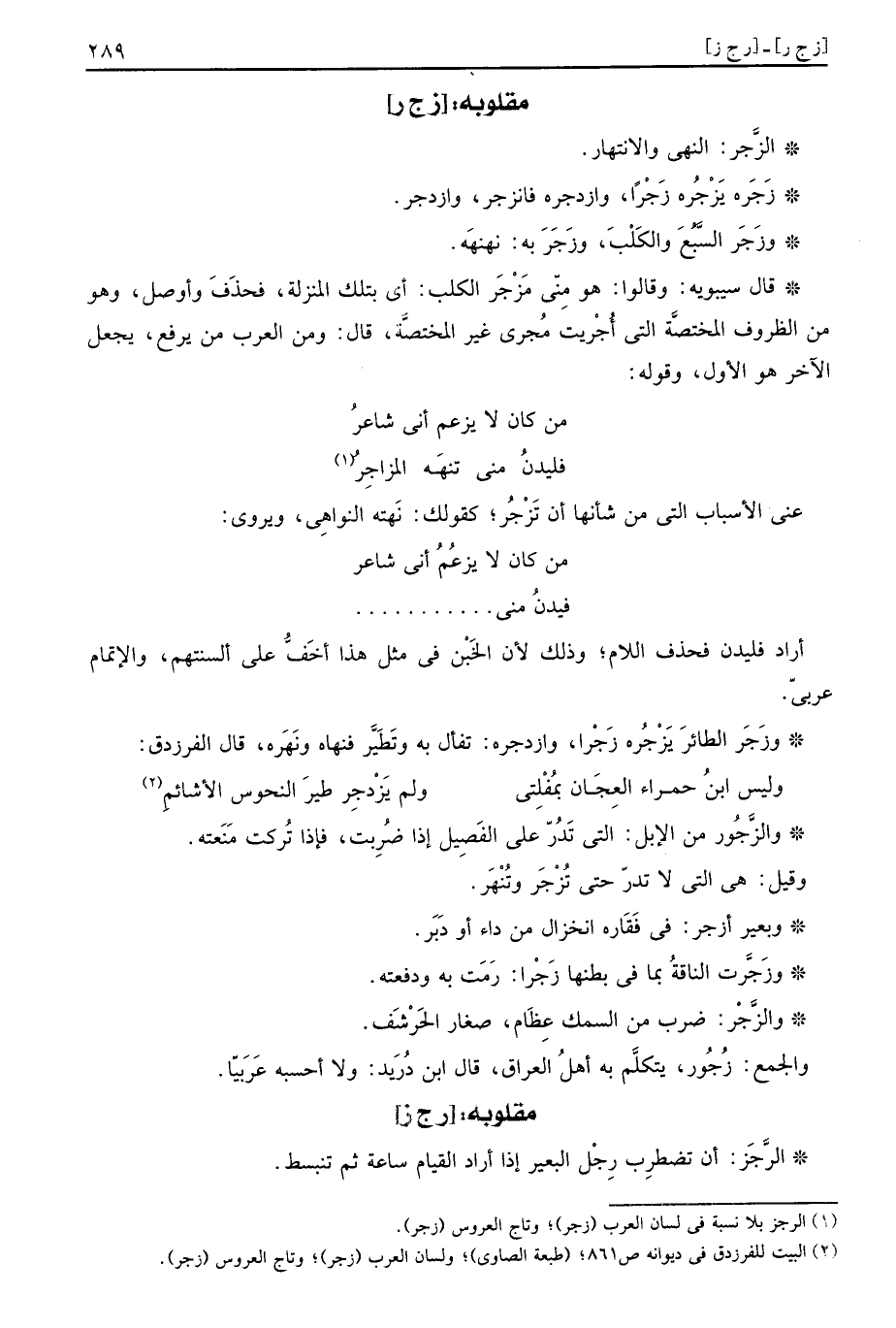 وَالْجمع: زُجُور، يتَكَلَّم بِهِ أهل الْعرَاق، قَالَ ابْن دُرَيْد: وَلَا احسبه عربياًّ.