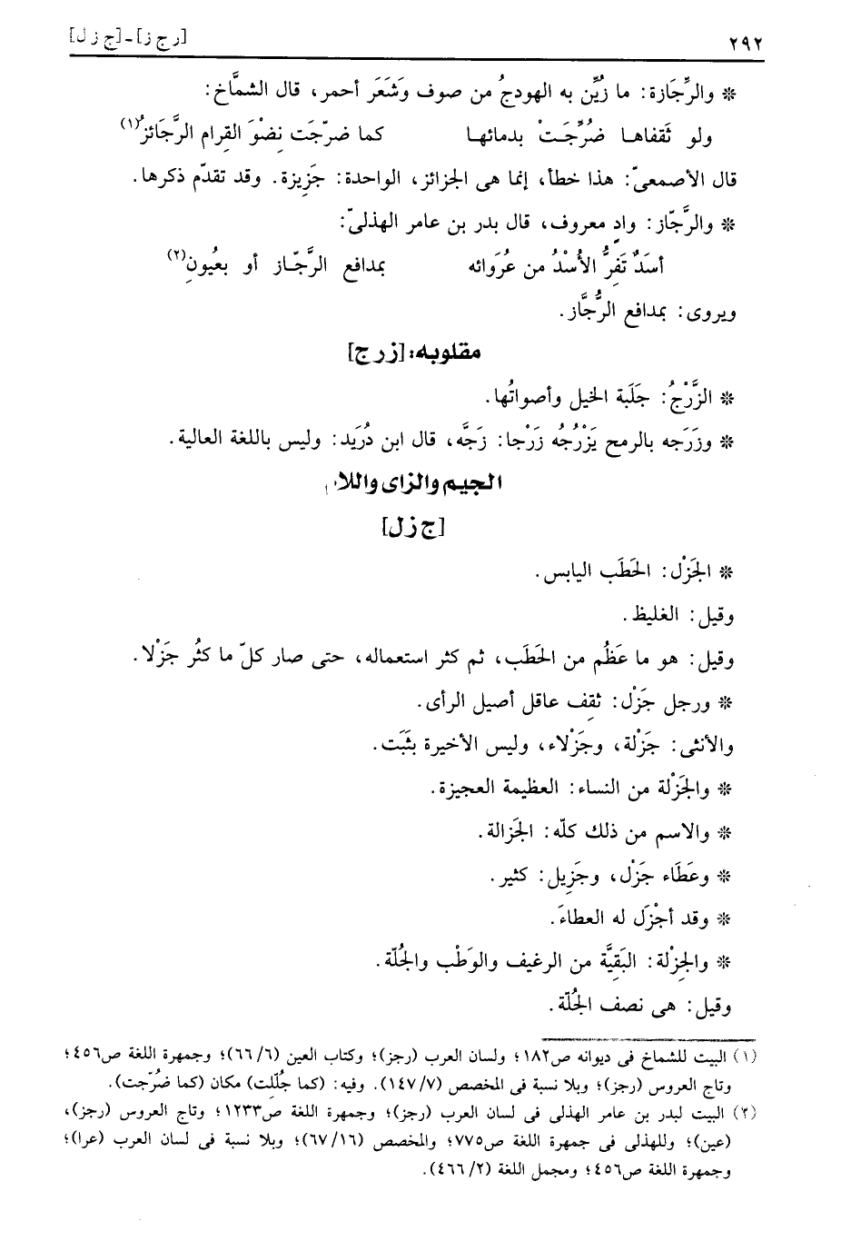 وزَرَجة بِالرُّمْحِ يَزْرجُهُ زَرْجا: زَجَّه، قَالَ ابْن دُرَيْد: وَلَيْسَ باللغة الْعَالِيَة.