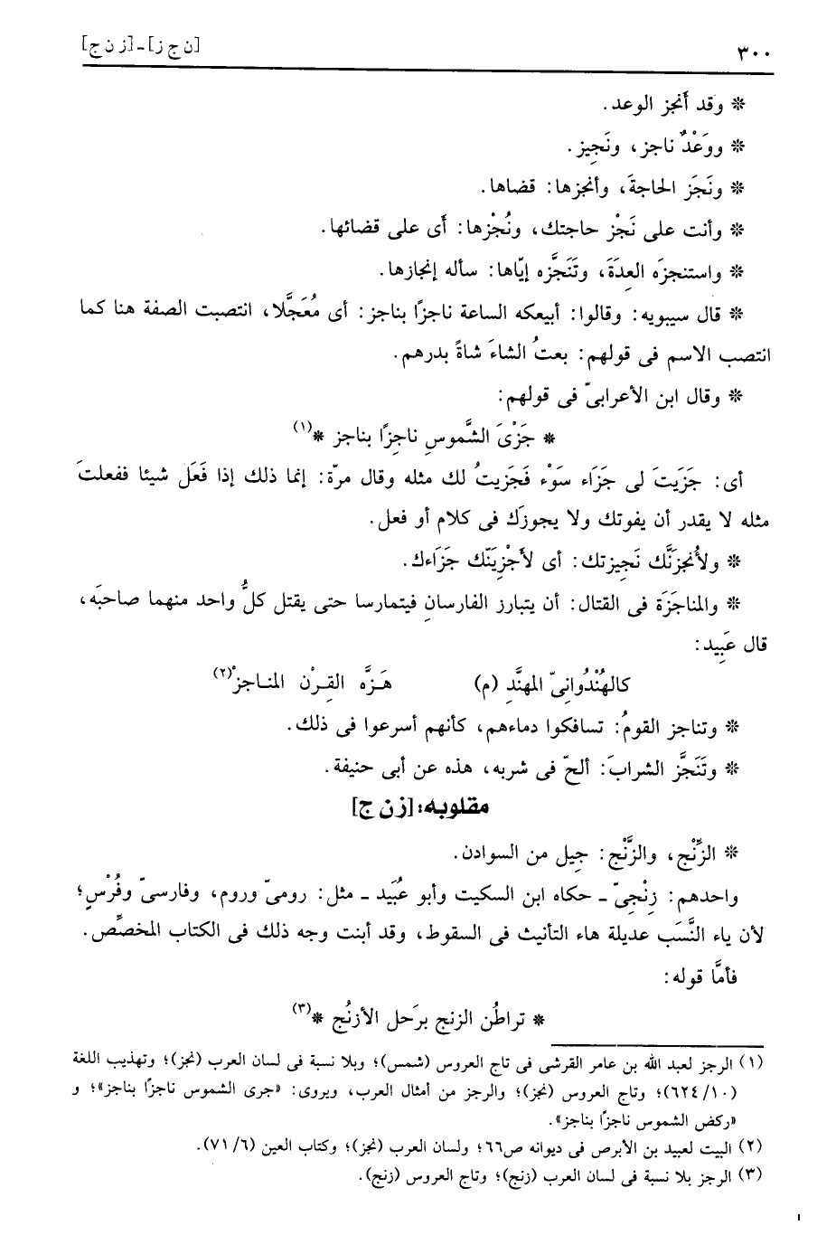 واحدهم: زِنْجِيّ، حَكَاهُ ابْن السّكيت وَأَبُو عبيد، مثل: رومي وروم، وفارسي وفرسٍ؛ لِأَن يَاء النّسَب عديلة هَاء التَّأْنِيث فِي السُّقُوط، وَقد أبنت وَجه ذَلِك فِي الْكتاب الْمُخَصّص.
