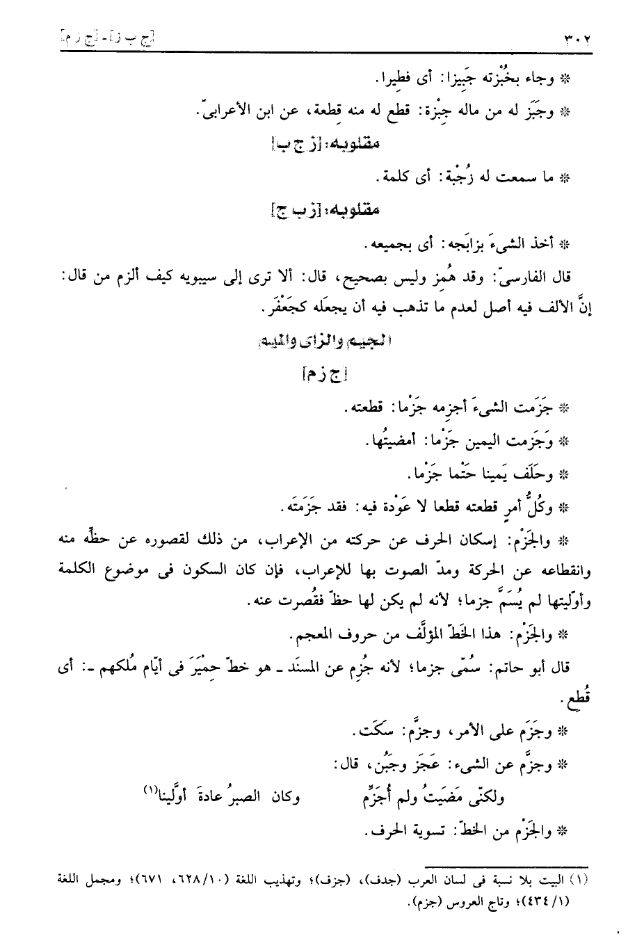 والجَزْم: هَذَا الْخط الْمُؤلف من حُرُوف المعجم. قَالَ أَبُو حَاتِم: سمي جزما؛ لِأَنَّهُ جُزِم عَن الْمسند، هُوَ خطّ حمير فِي أَيَّام ملكهم: أَي قطع.