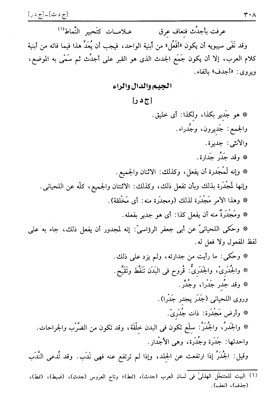 وَقد نفى سِيبَوَيْهٍ أَن يكون " أفْعُل " من أبنية الْوَاحِد، فَيجب أَن يعد هَذَا فِيمَا فَاتَهُ من أبنية كَلَام الْعَرَب، إِلَّا أَن يكون جمع الجدث الَّذِي هُوَ الْقَبْر على أجدُث ثمَّ سمي بِهِ الْموضع، ويروى: " أجدف " بِالْفَاءِ.