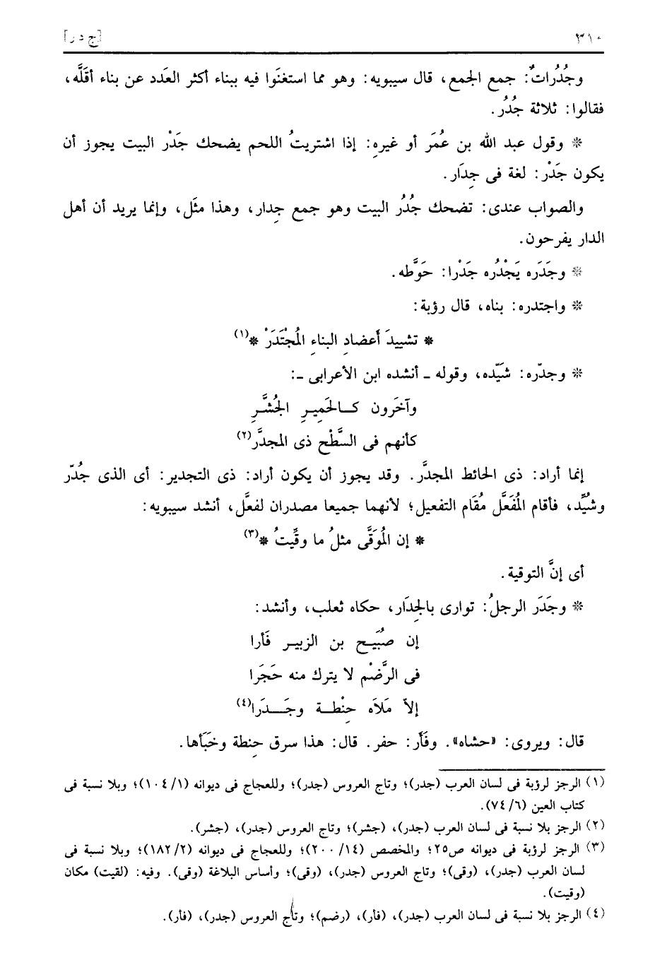 وجُدُرات: جمع الْجمع، قَالَ سِيبَوَيْهٍ: وَهُوَ مِمَّا استغنوا فِيهِ بِبِنَاء اكثر الْعدَد عَن بِنَاء أَقَله، فَقَالُوا: ثَلَاثَة جُدُر.