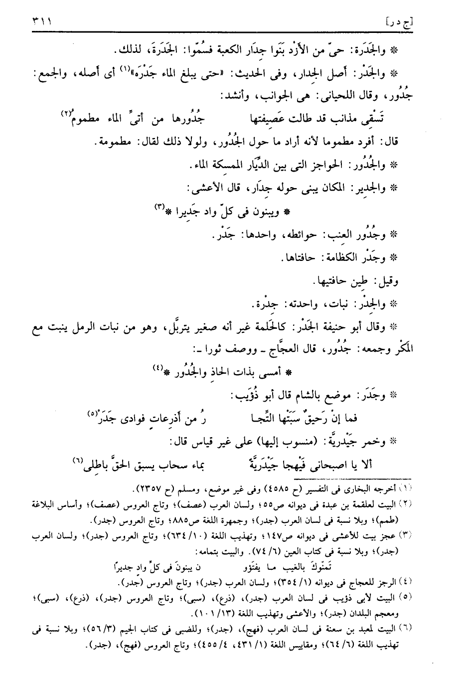 وَقَالَ أَبُو حنيفَة الجَدْر: كالحلمة غير انه صَغِير يتربل، وَهُوَ من نَبَات الرمل ينْبت مَعَ الْمَكْر وَجمعه: جُدُور، قَالَ العجاج، وَوصف ثورا: