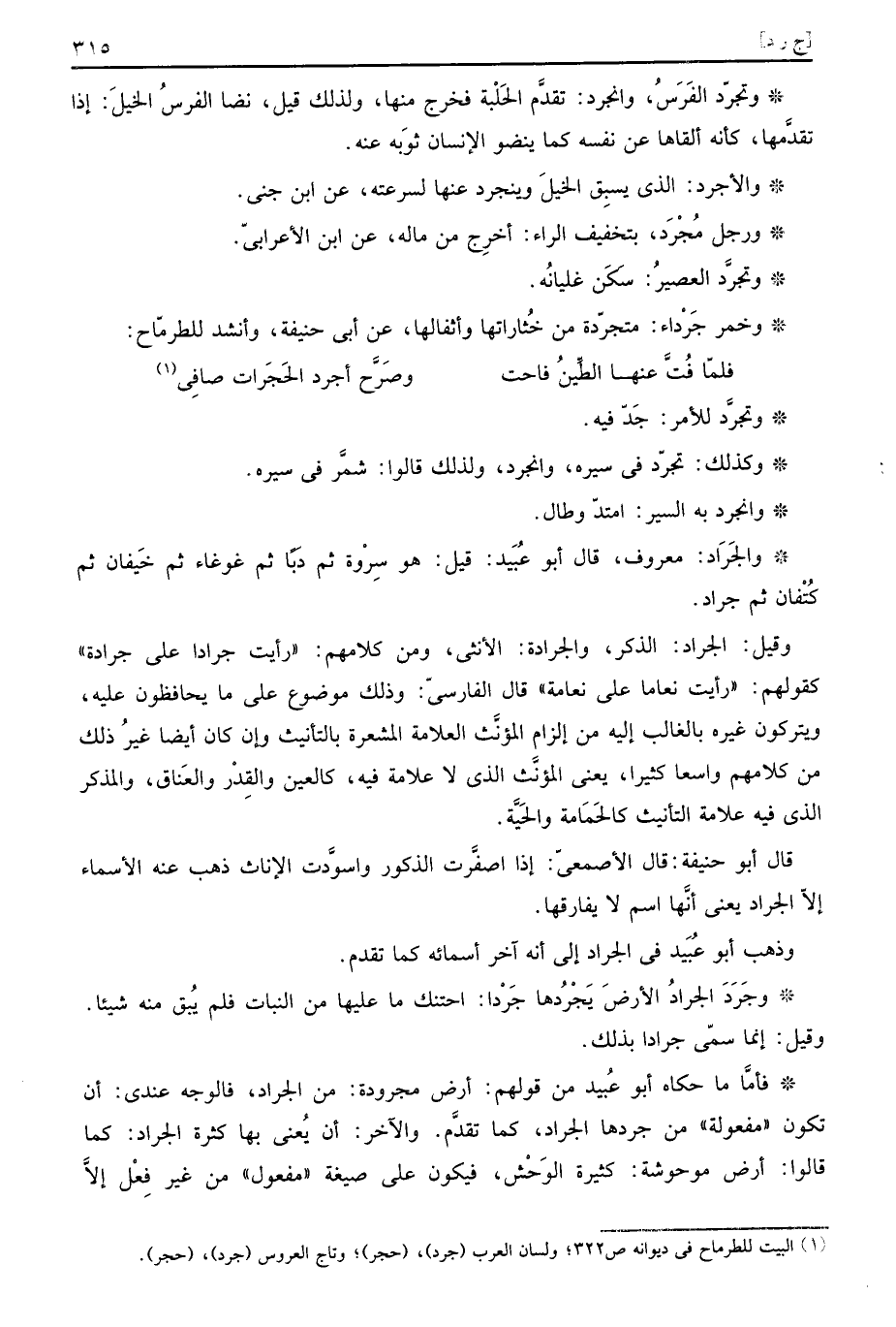 فَأَما مَا حَكَاهُ أَبُو عبيد من قَوْلهم: أر مجرودة: من الْجَرَاد، فَالْوَجْه عِنْدِي: أَن تكون " مفعولة " من جردها الْجَرَاد، كَمَا تقدم. وَالْآخر: أَن يَعْنِي بهَا كَثْرَة الْجَرَاد: كَمَا قَالُوا: أَرض موحوشة: كَثِيرَة الْوَحْش، فَيكون على صِيغَة " مفعول " من غير فعل إِلَّا