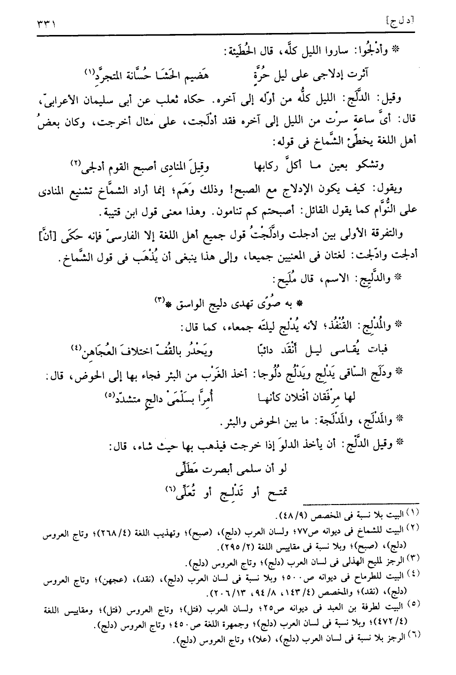 وَقيل: الدَّلَج: اللَّيْل كُله من أَوله إِلَى آخِره، حَكَاهُ ثَعْلَب عَن أبي سُلَيْمَان الْأَعرَابِي، قَالَ: أَي سَاعَة سرت من اللَّيْل إِلَى آخِره فقد أدْلَجت، على مِثَال أخرجت، وَكَانَ بعض أهل اللُّغَة يُخطئ الشماخ فِي قَوْله: