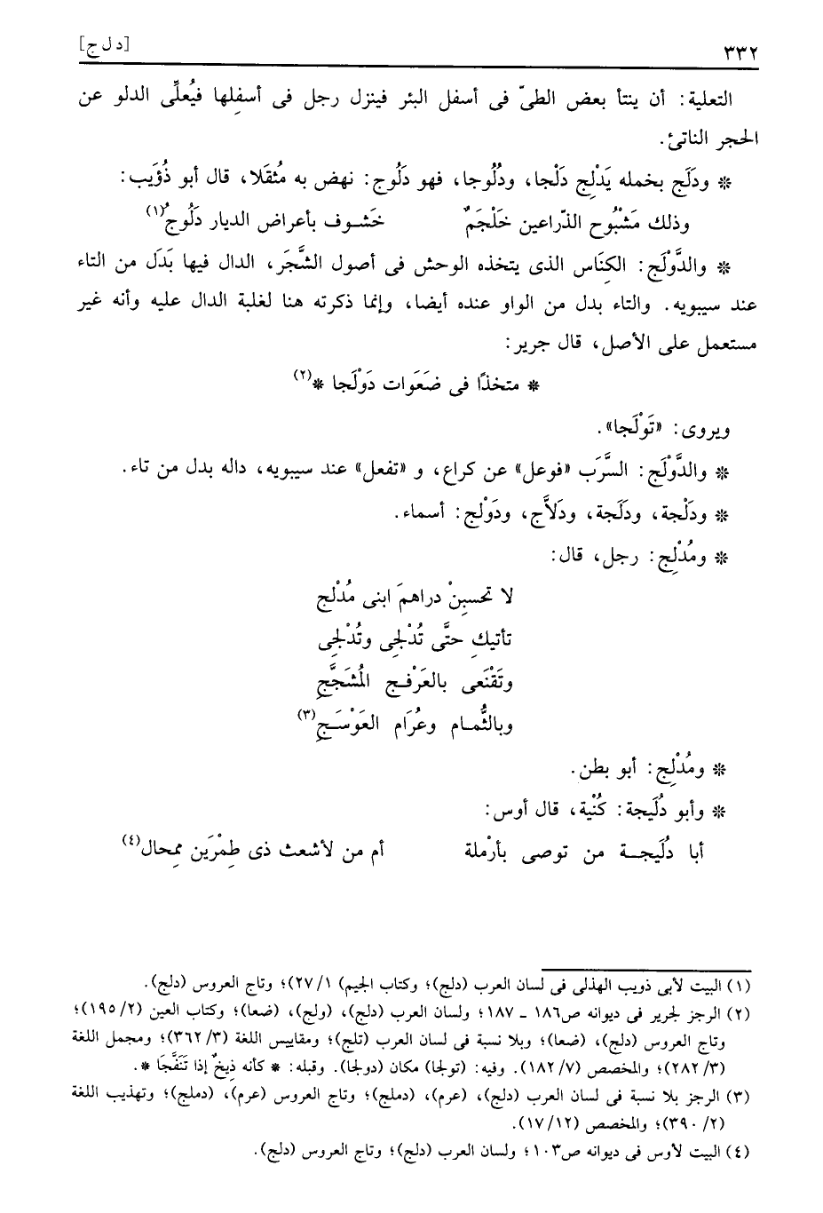 والدَّوْلَج: الكناس الَّذِي يَتَّخِذهُ الْوَحْش فِي أصُول الشّجر، الدَّال فِيهَا بدل من التَّاء عِنْد سِيبَوَيْهٍ. وَالتَّاء بدل من الْوَاو عِنْده أَيْضا، وَإِنَّمَا ذكرته هُنَا لغَلَبَة الدَّال عَلَيْهِ وَأَنه غير مُسْتَعْمل على الأَصْل، قَالَ جرير: