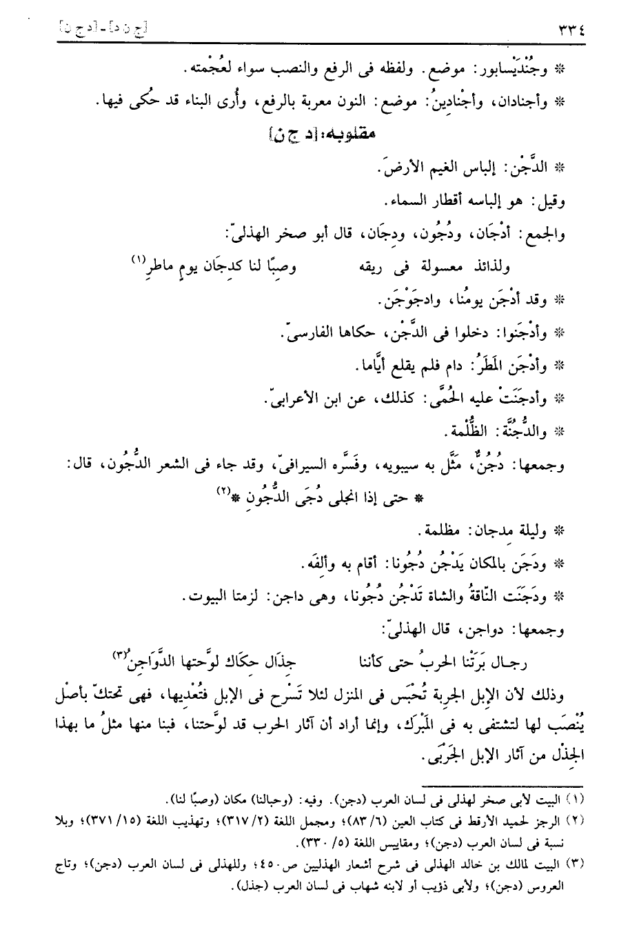 وَالْجمع: أدْجَان، ودُجُون، ودِجَان، قَالَ أَبُو صَخْر الْهُذلِيّ:
