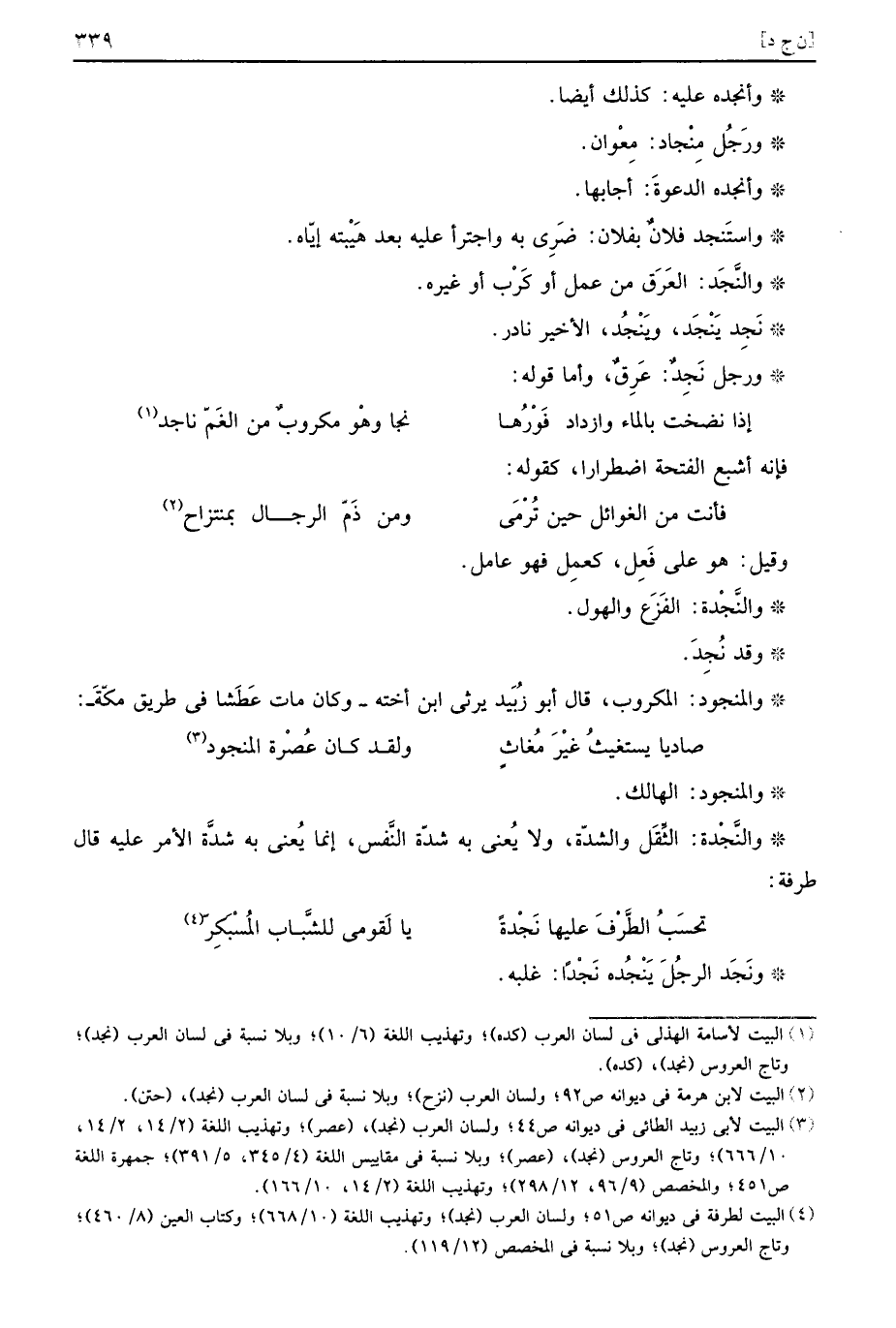 والنَّجْدة: الثّقل والشدة، وَلَا يَعْنِي بِهِ شدَّة النَّفس، إِنَّمَا يَعْنِي بِهِ شدَّة الْأَمر عَلَيْهِ قَالَ طرفَة: