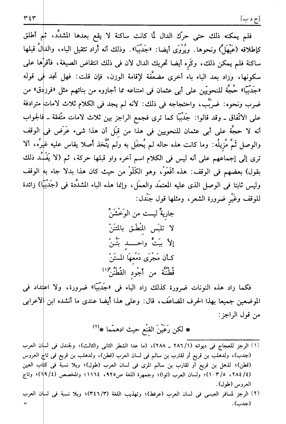 فَكَمَا زَاد هَذِه النونات ضَرُورَة كَذَلِك زَاد الْبَاء فِي " جَدْبَبّا " ضَرُورَة، وَلَا اعْتِدَاد فِي الْمَوْضِعَيْنِ جَمِيعًا بِهَذَا الْحَرْف المضاعف، قَالَ: وعَلى هَذَا أَيْضا عِنْدِي مَا أنْشدهُ ابْن الْأَعرَابِي من قَول الراجز: