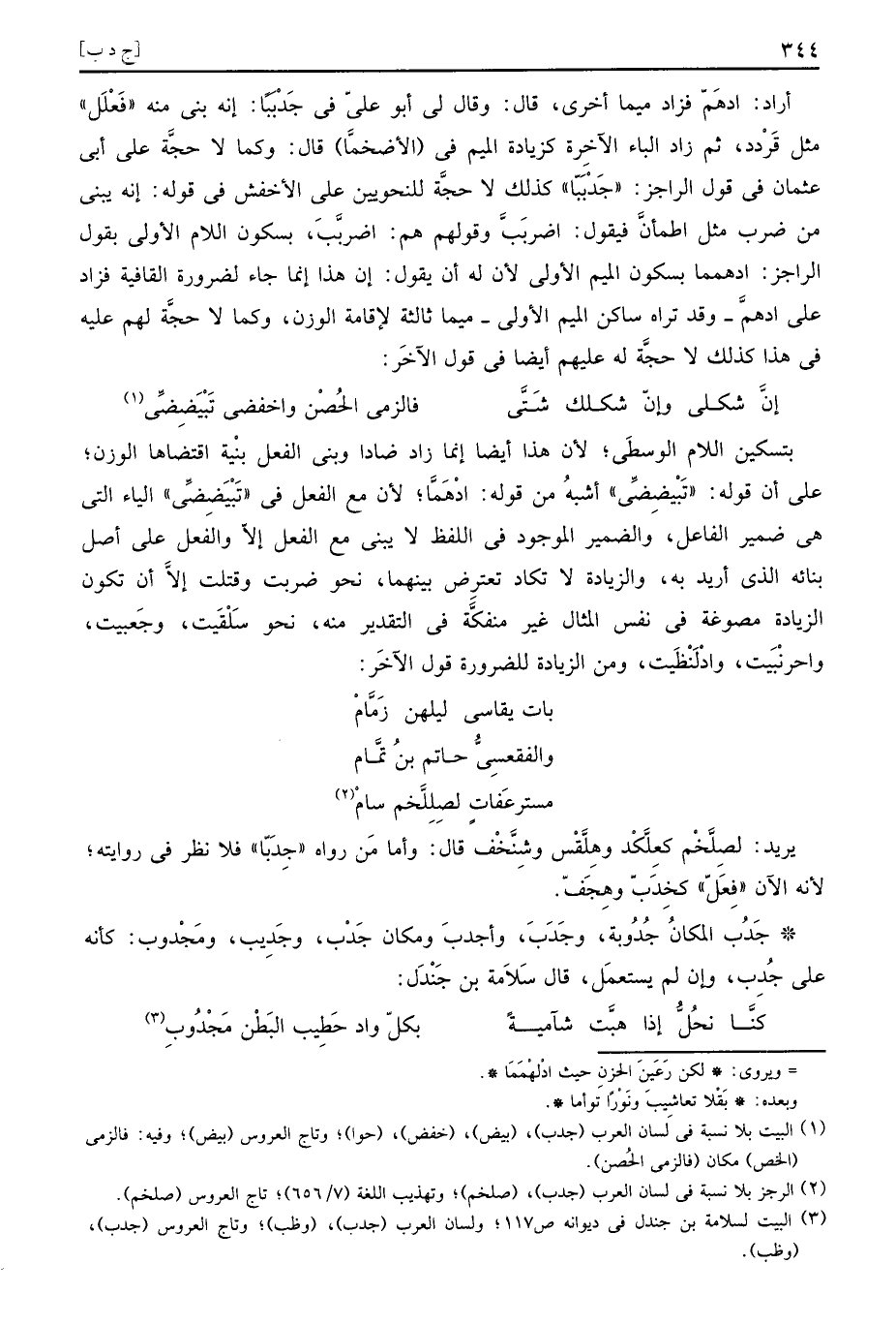 أَرَادَ: ادهم فَزَاد ميما أُخْرَى، قَالَ: وَقَالَ لي أَبُو عَليّ فِي جَدْبَبّا: إِنَّه بنى مِنْهُ " فَعْلَل " مثل قَرْدد، ثمَّ زَاد الْبَاء الْآخِرَة كزيادة الْمِيم فِي " الأضخمَّا " قَالَ: وكما لَا حجَّة على أبي عُثْمَان فِي قَول الراجز: " جَدْبَبّا " كَذَلِك لَا حجَّة للنحويين على الْأَخْفَش فِي قَوْله: إِنَّه يبْنى من ضرب مثل اطْمَأَن فَيَقُول: اضربَبَّ وَقَوْلهمْ هم: اضربَّبَ، بِسُكُون اللَّام الأولى بقول الراجز: ادهمما بِسُكُون الْمِيم الأولى لِأَن لَهُ أَن يَقُول: إِن هَذَا إِنَّمَا جَاءَ لضَرُورَة القافية فَزَاد على ادهم، وَقد نرَاهُ سَاكن الْمِيم الأولى، ميما ثَالِثَة لإِقَامَة الْوَزْن، وكما لَا حجَّة لَهُم عَلَيْهِ فِي هَذَا كَذَلِك لَا حجَّة لَهُ عَلَيْهِم أَيْضا فِي قَول الآخر: