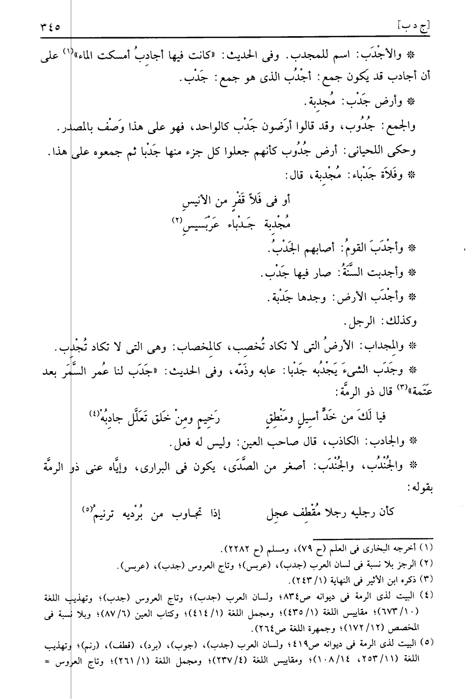 والأجْدَب: اسْم للمجدب. وَفِي الحَدِيث: " كَانَت فِيهَا أجادِبُ أَمْسَكت المَاء " على أَن أجادب قد يكون جمع: أجْدُب الَّذِي هُوَ جمع: جَدْب.