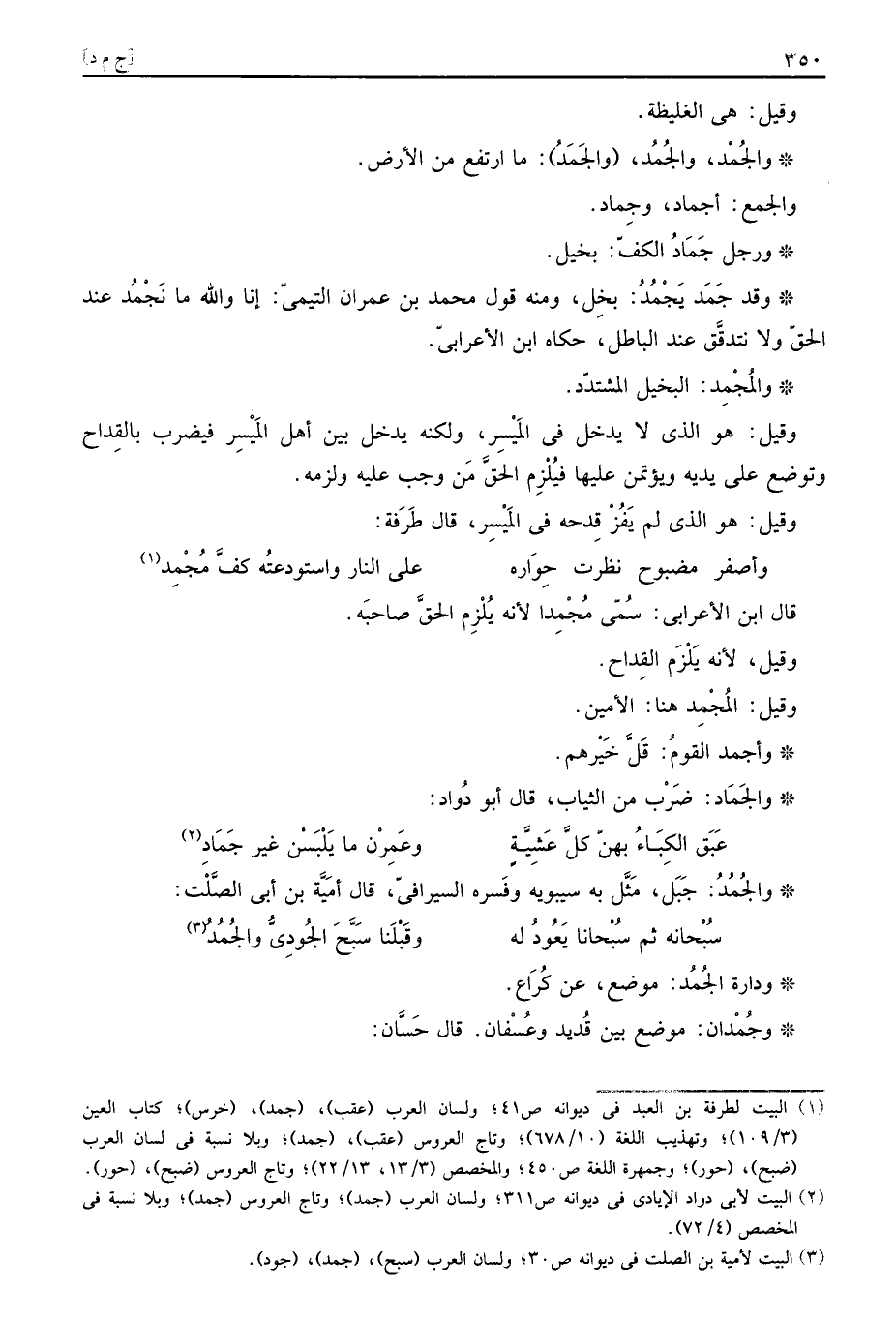 وَقد جَمَد يَجْمُدُ: بخل، وَمِنْه قَول مُحَمَّد ابْن عمرَان التَّيْمِيّ: إِنَّا وَالله مَا نَجْمُد عِنْد الْحق وَلَا نتدقَّق عِنْد الْبَاطِل، حَكَاهُ ابْن الْأَعرَابِي.