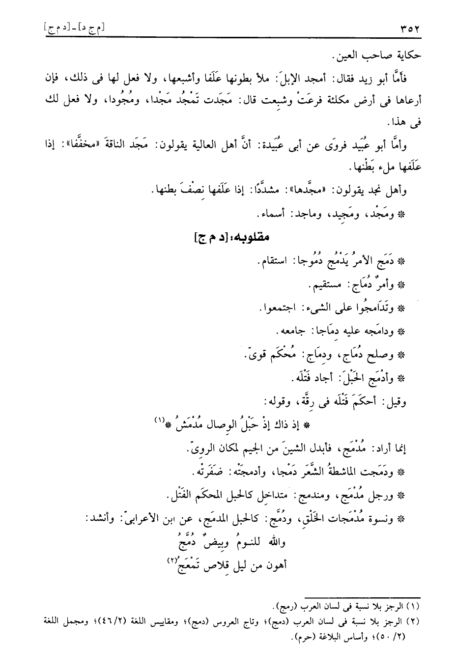 فَأَما أَبُو زيد فَقَالَ: أمجد الْإِبِل: مَلأ بطونها علفا وأشبعها، وَلَا فعل لَهَا فِي ذَلِك، فَإِن أرعاها فِي أَرض مكلئة فرعت وشبعت قَالَ: مَجَدت تَمْجُد مَجْدا، ومُجُودا، وَلَا فعل لَك فِي هَذَا.