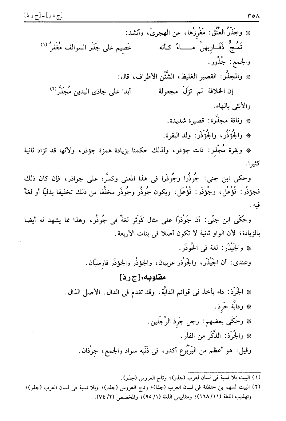 وبقرة مُجْذِر: ذَات جؤذر، وَلذَلِك حكمنَا بِزِيَادَة همزَة جؤذر، وَلِأَنَّهَا قد تزاد ثَانِيَة كثيرا.