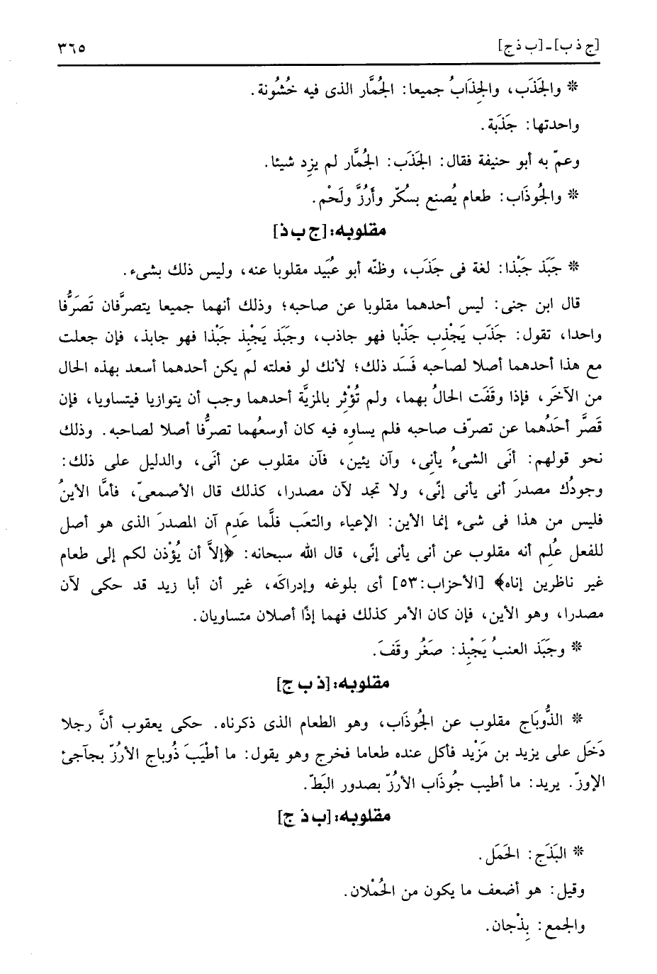 الذُّوبَاج: مقلوب عَن الجُوذَاب، وَهُوَ الطَّعَام الَّذِي ذَكرْنَاهُ. حكى يَعْقُوب أَن رجلا دخل على يزِيد بن مزِيد فاكل عِنْده طَعَاما فَخرج وَهُوَ يَقُول: مَا أطيب ذُوباج الأُرز بجآجئ الإوزّ. يُرِيد: مَا أطيب جُوذَاب الأُرزّ بصدر البَطّ.