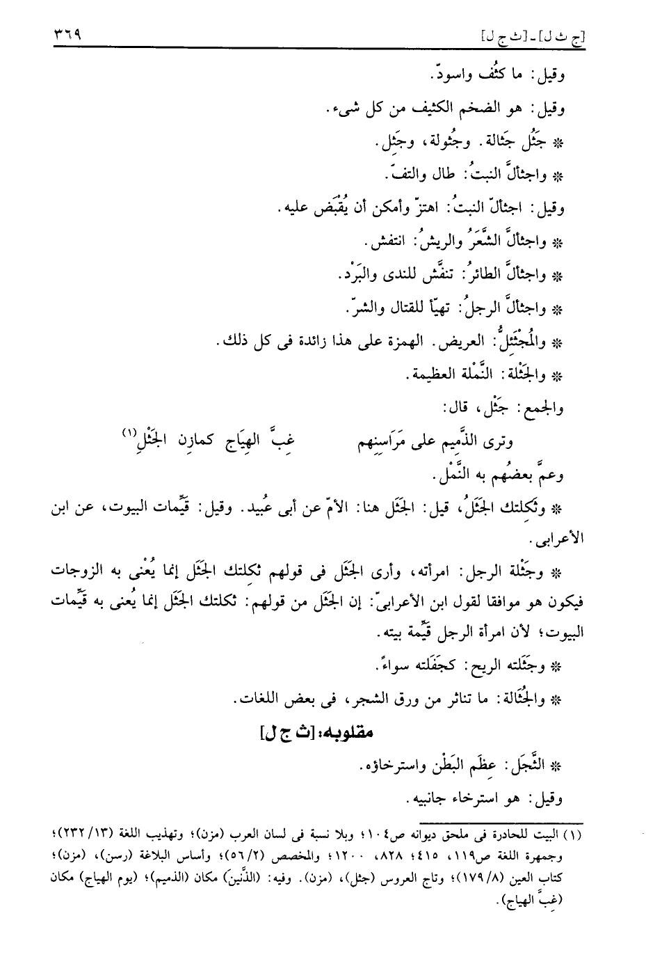 وَترى الذَّمِيم على مَرَاسِنِهم ... غِبَّ الهِيَاج كمازِن الجَثْلِ