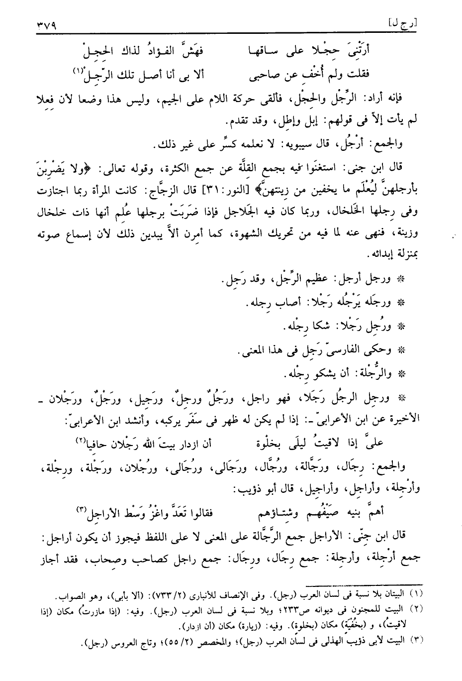 وَالْجمع: رِجَال، ورَجَّالة، ورُجَّال، ورَجَالي، ورُجَالي، ورُجْلان، ورَجْلة، ورِجْلة، وأرْجِلة، وأراجِل، وأراجِيل، قَالَ أَبُو ذُؤَيْب: