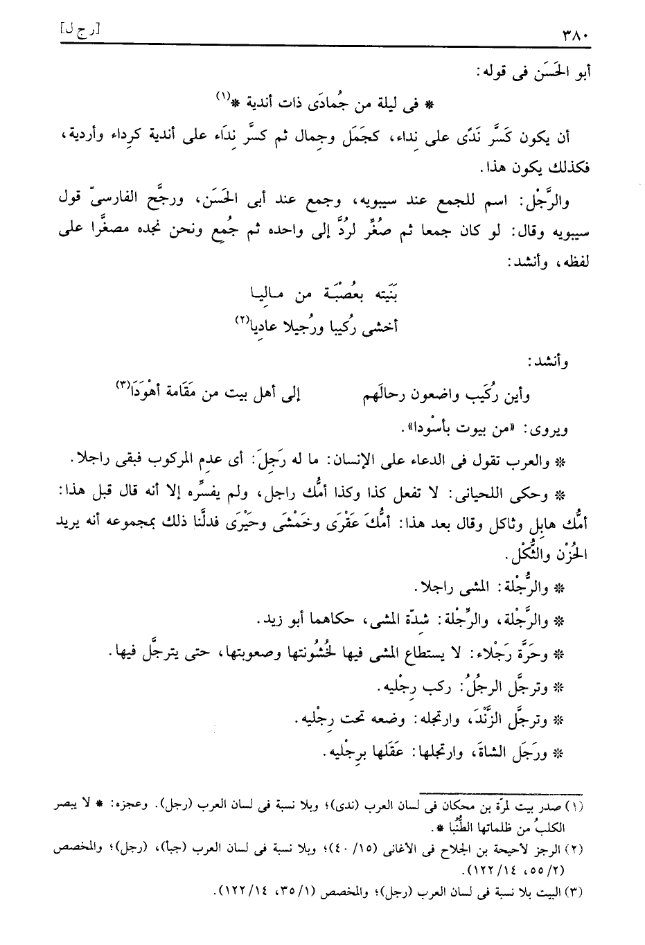 والرَّجْل: اسْم للْجمع عِنْد سِيبَوَيْهٍ، وَجمع عِنْد أبي الْحسن. وَرجح الْفَارِسِي قَول سِيبَوَيْهٍ وَقَالَ: لَو كَانَ جمعا ثمَّ صغر لرد إِلَى واحده ثمَّ جمع وَنحن نجده مُصَغرًا على لَفظه، وَأنْشد:
