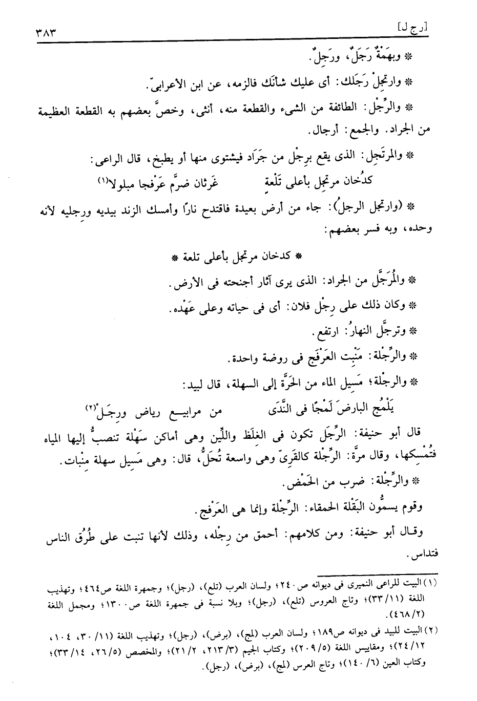 قَالَ أَبُو حيفة: الرِّجَل تكون فِي الغلظ واللين وَهِي أَمَاكِن سهلة تنصب إِلَيْهَا الْمِيَاه فتمسكها، وَقَالَ مُرَّة: الرِّجْلة كالقَرِىّ وَهِي وَاسِعَة تحل، قَالَ: وَهِي مسيل سهلة منبات.
