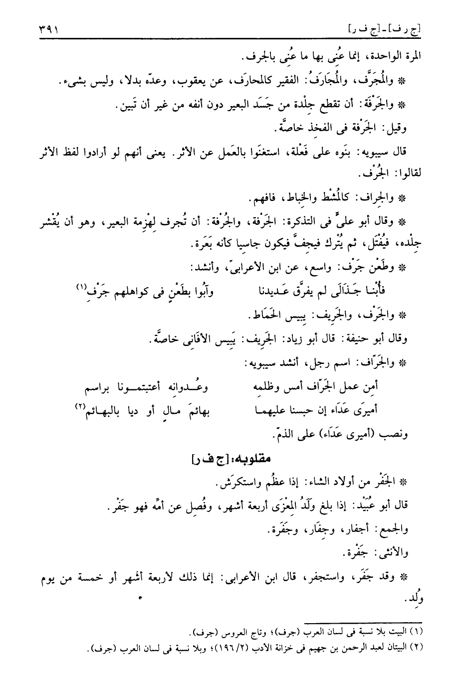 قَالَ سِيبَوَيْهٍ: بنوه على فَعْلة، استغنوا بِالْعَمَلِ عَن الْأَثر. يَعْنِي انهم لَو أَرَادوا لفظ الْأَثر لقالوا: الجُرْف.