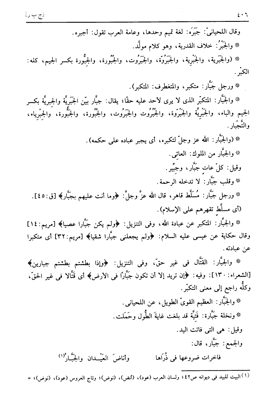 والجَبَّار: المتكبر عَن عبَادَة الله، وَفِي التَّنْزِيل: (ولم يكن جَبَّارا عصيا) وَقَالَ حِكَايَة عَن عِيسَى عَلَيْهِ السَّلَام: (ولم يَجْعَلنِي جبَّارا شقيا) أَي متكبرا عَن عِبَادَته.