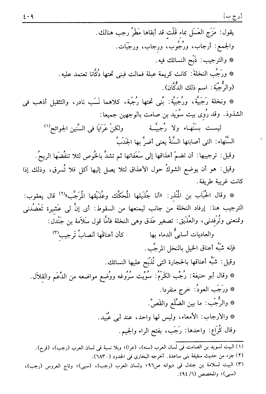 ونخلة رَجَبيَّة، ورُجَبيَّة: بني تحتهَا رُجْبة، كِلَاهُمَا نسب نَادِر، والتثقيل أذهب فِي الشذوذ. وَقد رُوِيَ بَيت السويد بن صَامت بِالْوَجْهَيْنِ جَمِيعًا: