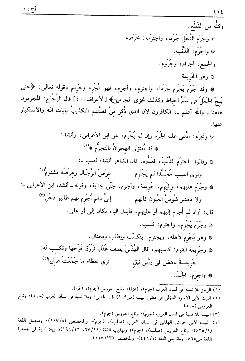 وَقد جَرَم يَجْرِم جَرْما، واجترم، وأَجرم، فَهُوَ مُجْرِم وجَرِيم وَقَوله تَعَالَى: (حَتَّى يَلِجَ الجَمَلُ فِي سَمِّ الخِياط وَكَذَلِكَ نجزي الْمُجْرمين) قَالَ الزّجاج: المجرمون هَاهُنَا، وَالله أعلم: الْكَافِرُونَ لِأَن الَّذِي ذكر من قصتهم التَّكْذِيب بآيَات الله والاستكبار عَنْهَا.