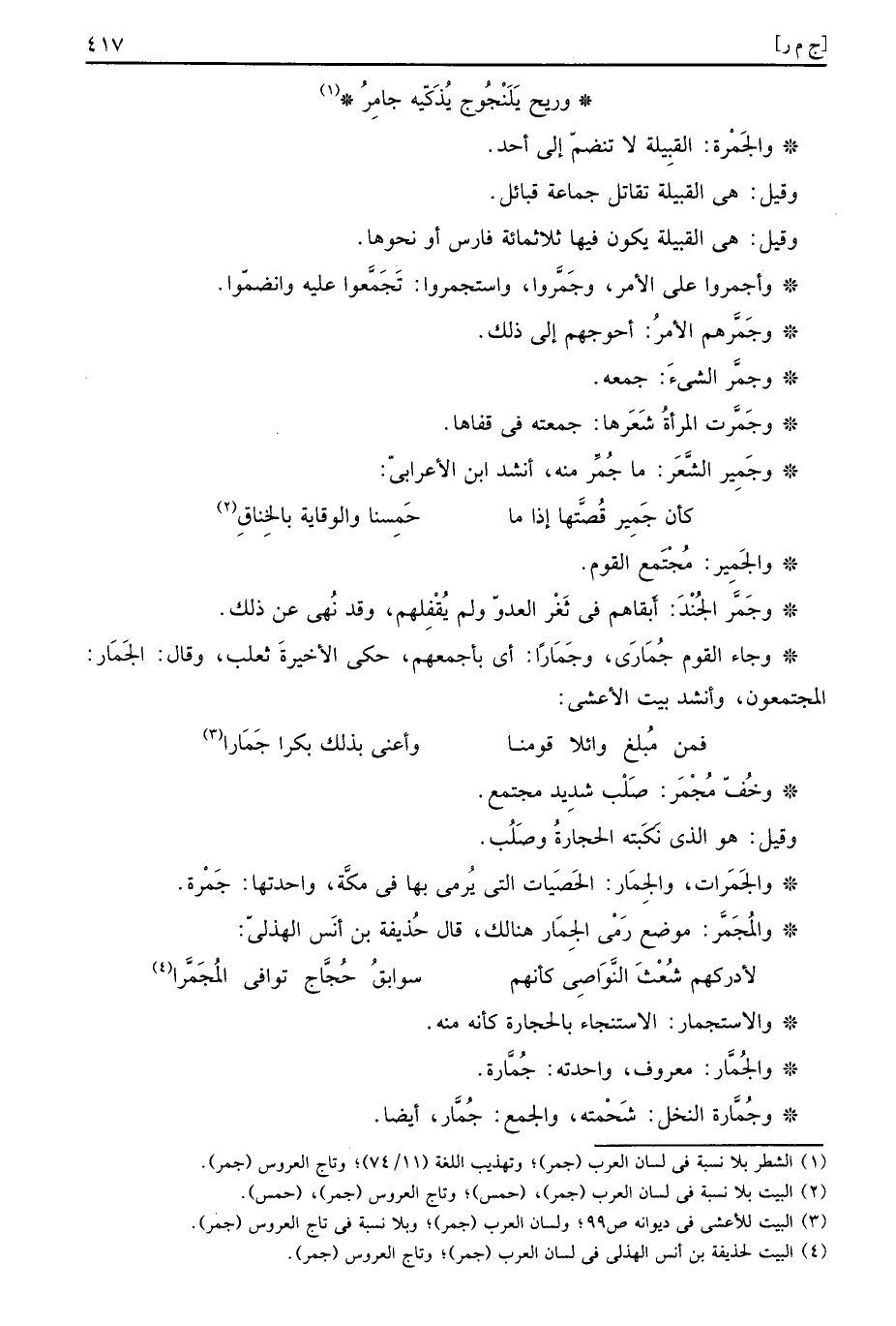 وَجَاء الْقَوْم جُمَارَى، وجُمَاراً: أَي بأجمعهم، حكى الْأَخِيرَة ثَعْلَب، وَقَالَ: الْجمار: المجتمعون، وَأنْشد بَيت الْأَعْشَى: