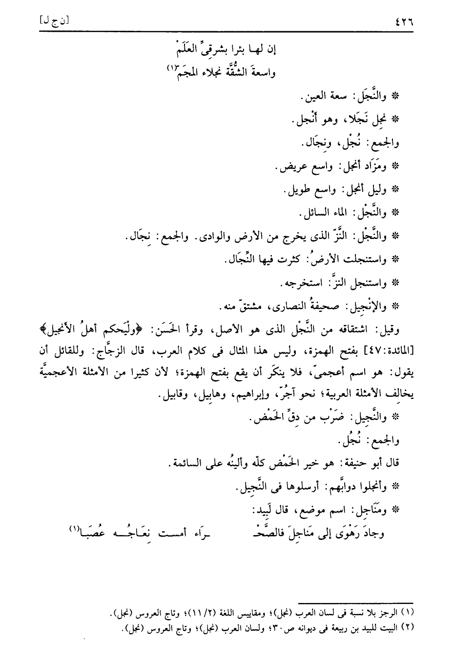 وَقيل: اشتقاقه من النَّجْل الَّذِي هُوَ الأَصْل، وَقَرَأَ الْحسن: (وليحكم أهل الأنجيل) بِفَتْح الْهمزَة، وَلَيْسَ هَذَا الْمِثَال فِي كَلَام الْعَرَب، قَالَ الزّجاج: وللقائل أَن يَقُول: هُوَ اسْم أعجمي، فَلَا يُنكر أَن يَقع بِفَتْح الْهمزَة؛ لِأَن كثيرا من الامثلة الأعجمية يُخَالف الْأَمْثِلَة الْعَرَبيَّة؛ نَحْو آجر، وَإِبْرَاهِيم، وهابيل، وقابيل.
