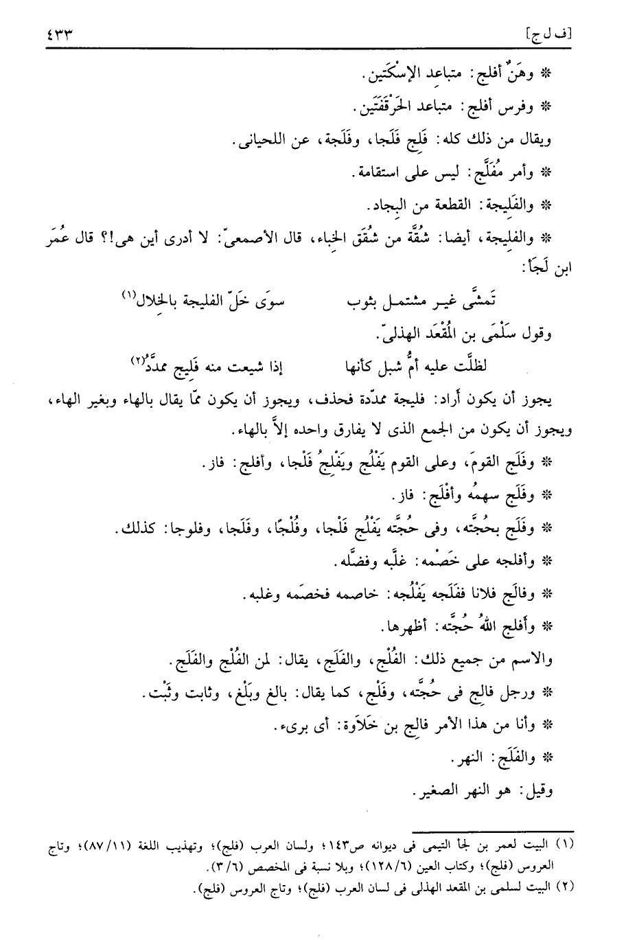 يجوز أَن يكون أَرَادَ: فليجة ممددة فَحذف، وَيجوز أَن يكون مِمَّا يُقَال بِالْهَاءِ وَبِغير الْهَاء. وَيجوز أَن يكون من الْجمع الَّذِي لَا يُفَارق واحده إِلَّا بِالْهَاءِ.