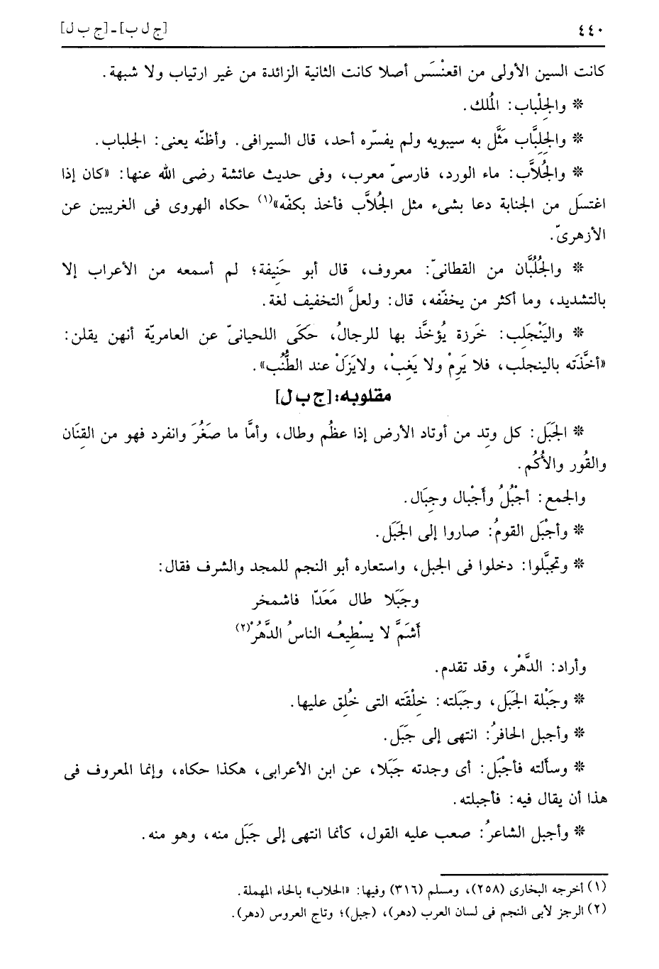 والجُلُبَّان من القطاني: مَعْرُوف، قَالَ أَبُو حنيفَة؛ لم اسْمَعْهُ من الْأَعْرَاب إِلَّا بِالتَّشْدِيدِ، وَمَا اكثر من يخففه، قَالَ: وَلَعَلَّ التَّخْفِيف لُغَة.
