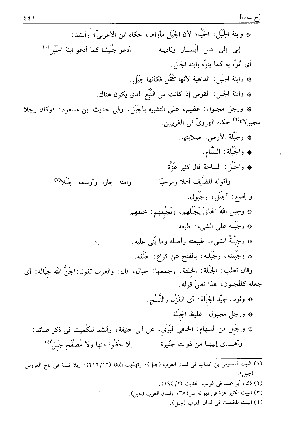 والجَبِل من السِّهَام: الجافي الْبري، عَن أبي حنيفَة، وَأنْشد للكميت فِي ذكر صائد: