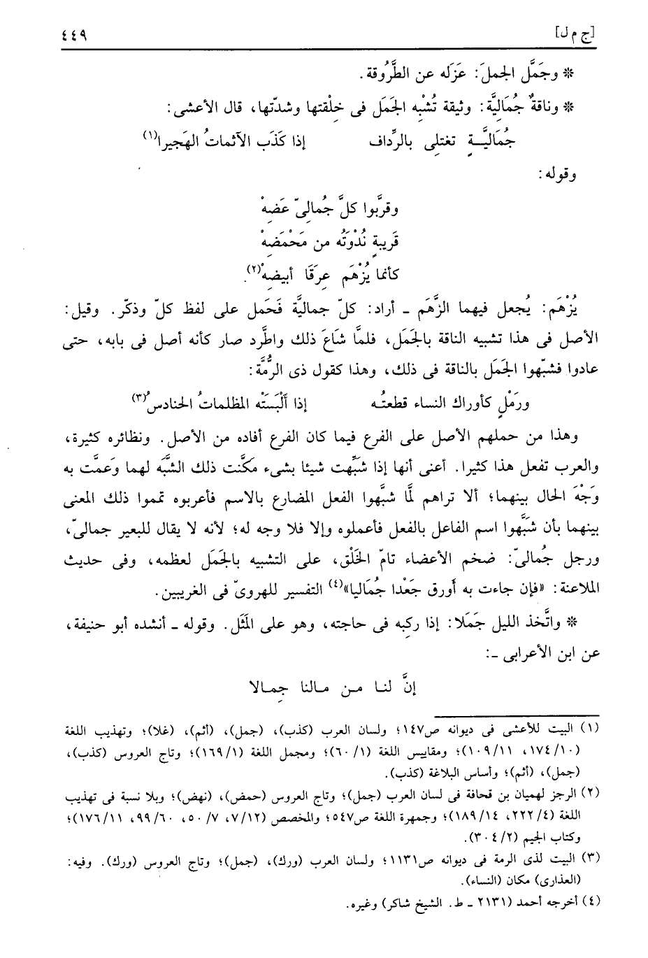 وَهَذَا من حملهمْ الأَصْل على الْفَرْع فِيمَا كَانَ الْفَرْع أَفَادَهُ من الأَصْل. ونظائرهكثيرة، وَالْعرب تفعل هَذَا كثيرا، اعني أَنَّهَا إِذا شبهت شَيْئا بِشَيْء مكنت ذَلِك الشّبَه لَهما وعمت بِهِ وَجه الْحَال بَينهمَا؛ أَلا تراهم لما شبهوا الْفِعْل الْمُضَارع بِالِاسْمِ فأعربوه تمموا ذَلِك الْمَعْنى بَينهمَا بِأَن شبهوا اسْم الْفَاعِل بِالْفِعْلِ فأعملوه وَإِلَّا فَلَا وَجه لَهُ؛ لِأَنَّهُ لَا يُقَال للبعير جمالي. وَرجل جمالي: ضخم الْأَعْضَاء تَامّ الْخلق، على التَّشْبِيه بالجمل لعظمه، وَفِي حَدِيث الْمُلَاعنَة: " فَإِن جَاءَت بِهِ أَوْرَق جَعدًا جُمَاليا " التَّفْسِير للهروي فِي الغريبين.