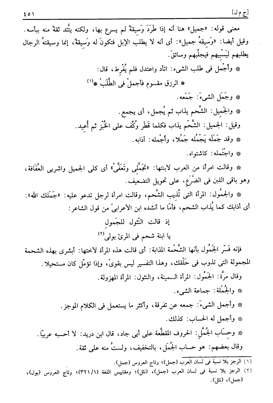فَإِنَّهُ فسر الجَمُول بِأَنَّهَا الشحمة المذابة: أَي قَالَت هَذِه الْمَرْأَة لأختها: أَبْشِرِي بِهَذِهِ الشحمة المجمولة الَّتِي تذوب فِي حلقك، وَهَذَا التَّفْسِير لَيْسَ بِقَوي، وَإِذا تؤمل كَانَ مستحيلا.