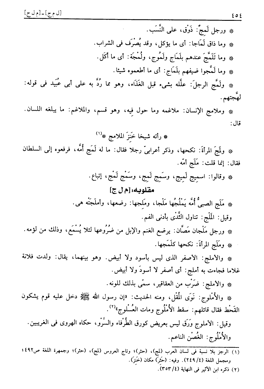 ولَمَج الْمَرْأَة: نَكَحَهَا، وَذكر اعرابي رجلا فَقَالَ: مَاله لمج أمه، فَرَفَعُوهُ إِلَى السُّلْطَان فَقَالَ: إِنَّمَا قلت: مَلَج أمه.