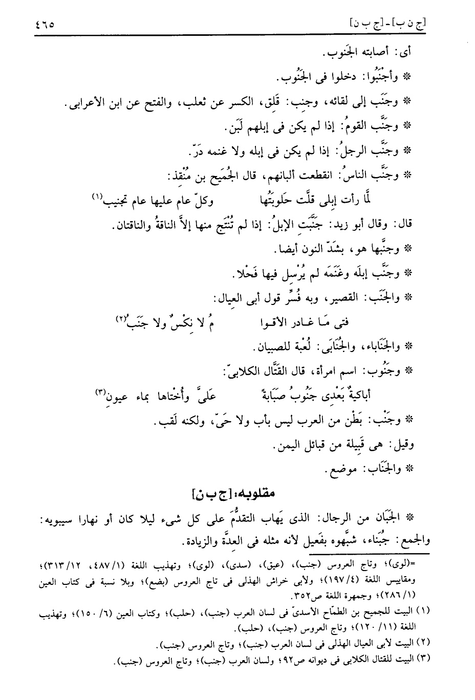 مقلوبه: (ج ب ن) الجَبَان من الرِّجَال الَّذِي يهاب التَّقَدُّم على كل شَيْء لَيْلًا كَانَ أَو نَهَارا. سِيبَوَيْهٍ: وَالْجمع جبناء، شبهوه بفعيل لِأَنَّهُ مثله فِي الْعدة وَالزِّيَادَة.