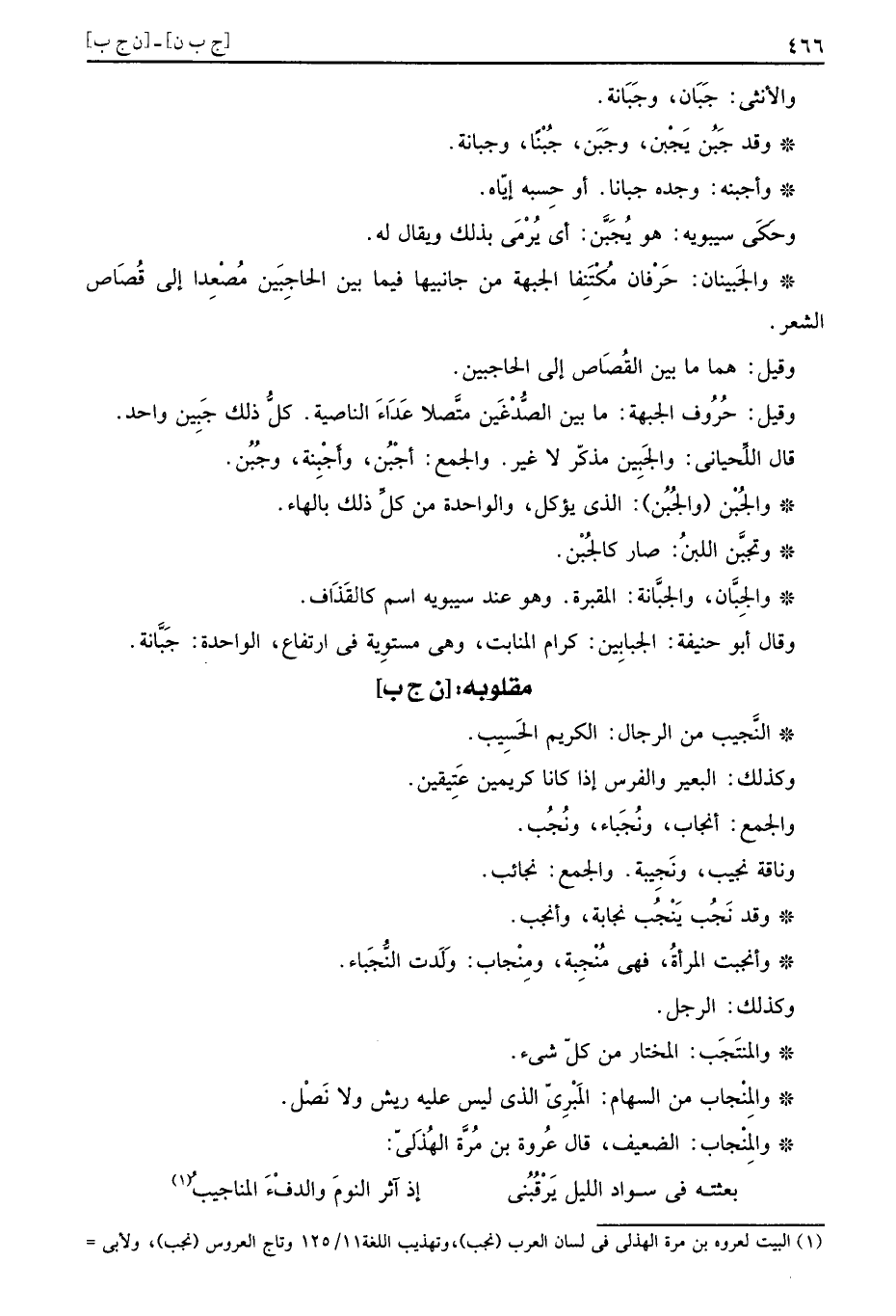 مقلوبه: (ن ج ب) النَّجيب من الرِّجَال: الْكَرِيم الحسيب.