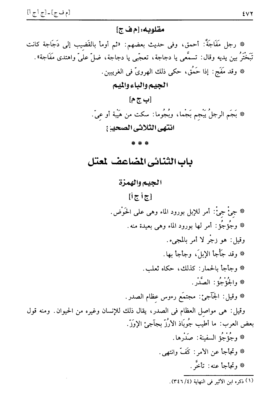 رجل مَفَاجَةٌ: احمق، وَفِي حَدِيث بَعضهم: " ثمَّ أَوْمَأ بالقضيب إِلَى دجَاجَة كَانَت تبختر بَين يَدَيْهِ وَقَالَ: تسمعي يَا دجَاجَة، تعجبي يَا دجَاجَة، ضل عَليّ واهتدي مَفَاجة ".