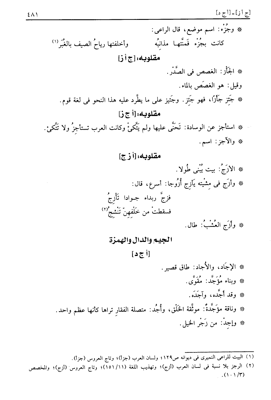 أستأجز عَن الوسادة: تحنى عَلَيْهَا وَلم يتكئ وَكَانَت الْعَرَب تستأجِزُ وَلَا تَتَّكئ.