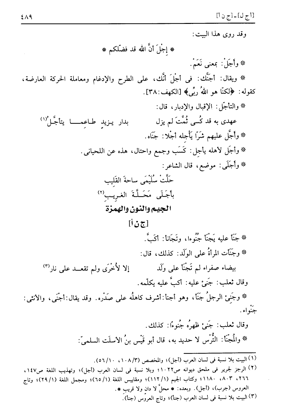 وَيُقَال: أجَنَّك: فِي اجل أَنَّك، على الطرح والإدغام ومعاملة الْحَرَكَة الْعَارِضَة، كَقَوْلِه: (لَكنا هُوَ الله رَبِّي) .