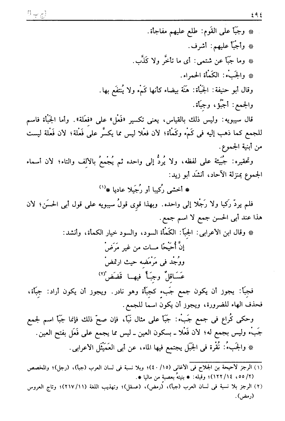 فجِبَأ: يجوز أَن يكون جمع جَبٍء كجِبَأة وَهُوَ نَادِر. وَيجوز أَن يكون أَرَادَ: جبأة، فَحذف الْهَاء للضَّرُورَة، وَيجوز أَن يكون اسْما للْجمع.