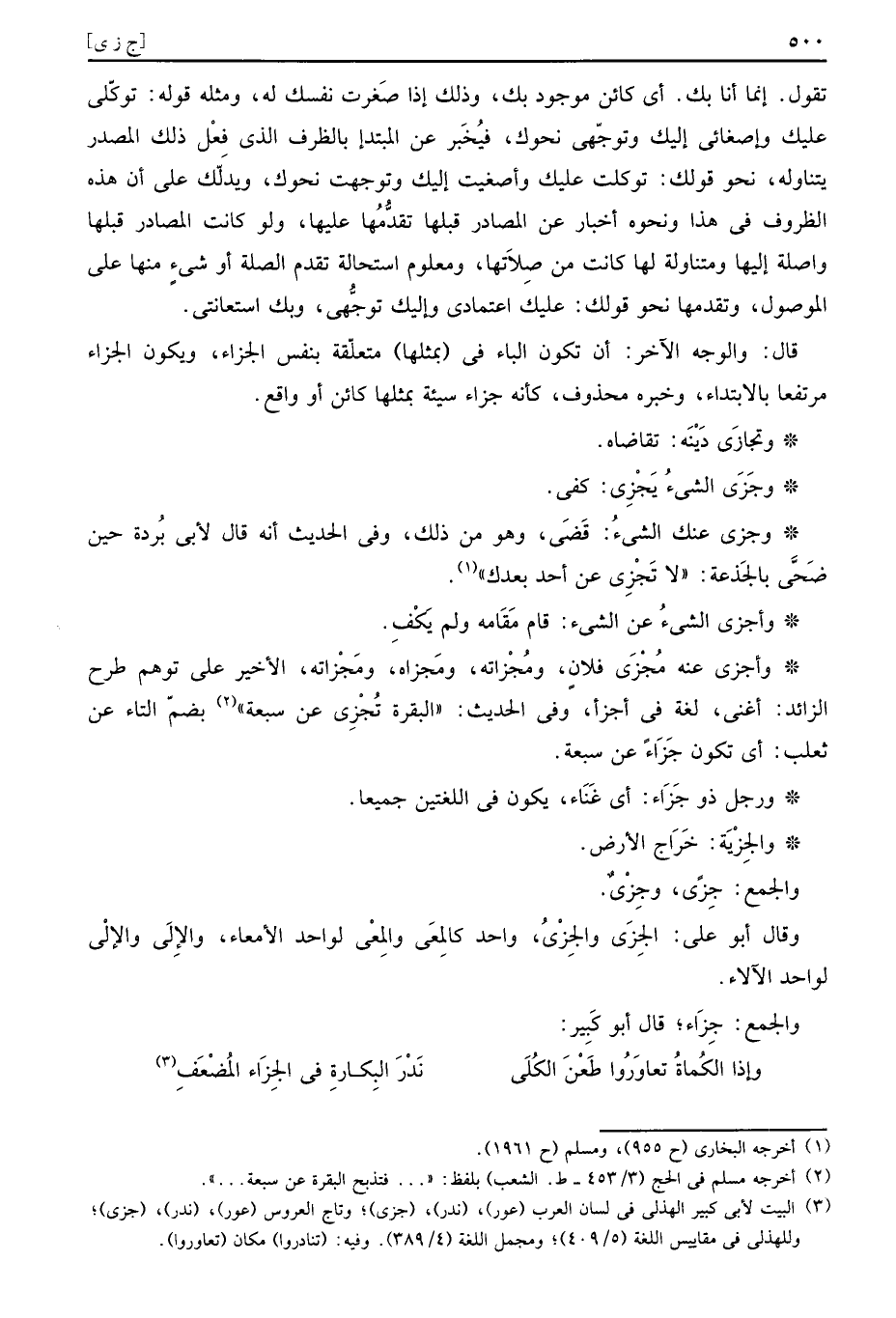 تَقول. إِنَّمَا أَنا بك أَي كَائِن مَوْجُود بك، وَذَلِكَ إِذا صغرت نَفسك لَهُ، وَمثله قَوْله: توكلي عَلَيْك وإصغائي إِلَيْك وتوجهي نَحْوك، فيخبر عَن الْمُبْتَدَأ بالظرف الَّذِي فعل ذَلِك الْمصدر يتَنَاوَلهُ، نَحْو قَوْلك: توكلت عَلَيْك وأصغيت إِلَيْك وتوجهت نَحْوك، ويدلك على أَن هَذِه الظروف فِي هَذَا وَنَحْوه أَخْبَار عَن المصادر قبلهَا تقدمها عَلَيْهَا، وَلَو كَانَت المصادر قبلهَا واصلة إِلَيْهَا ومتناولة لَهَا كَانَت من صلَاتهَا، وَمَعْلُوم اسْتِحَالَة تقدم الصِّلَة أَو شَيْء مِنْهَا على الْمَوْصُول، وتقدمها نَحْو قَوْلك: عَلَيْك اعتمادي وَإِلَيْك تَوَجُّهِي، وَبِك استعانتي.