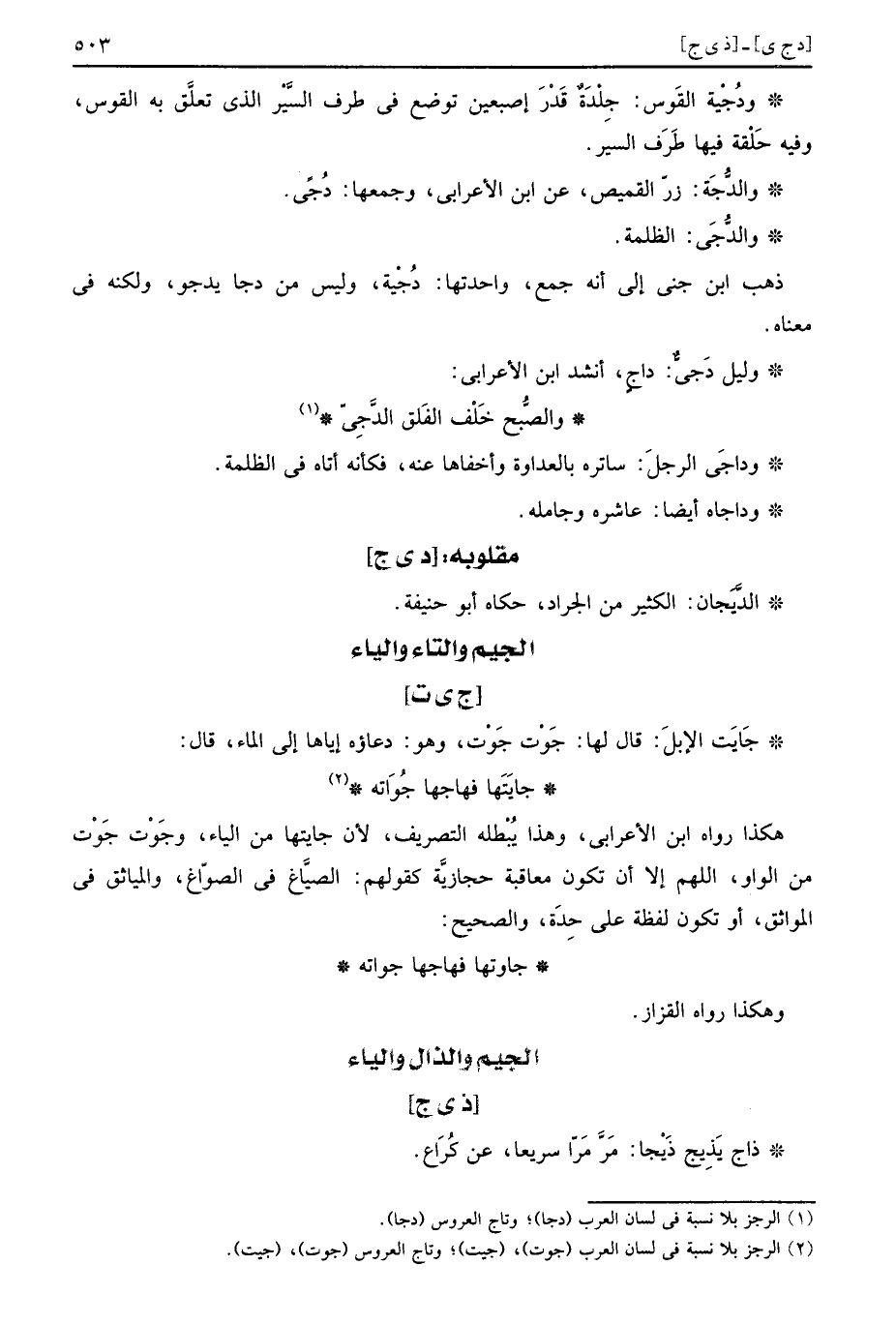 ذهب ابْن جني إِلَى أَنه جمع، واحدتها: دُجْية، وَلَيْسَ من دجا يدجو، وَلكنه فِي مَعْنَاهُ.