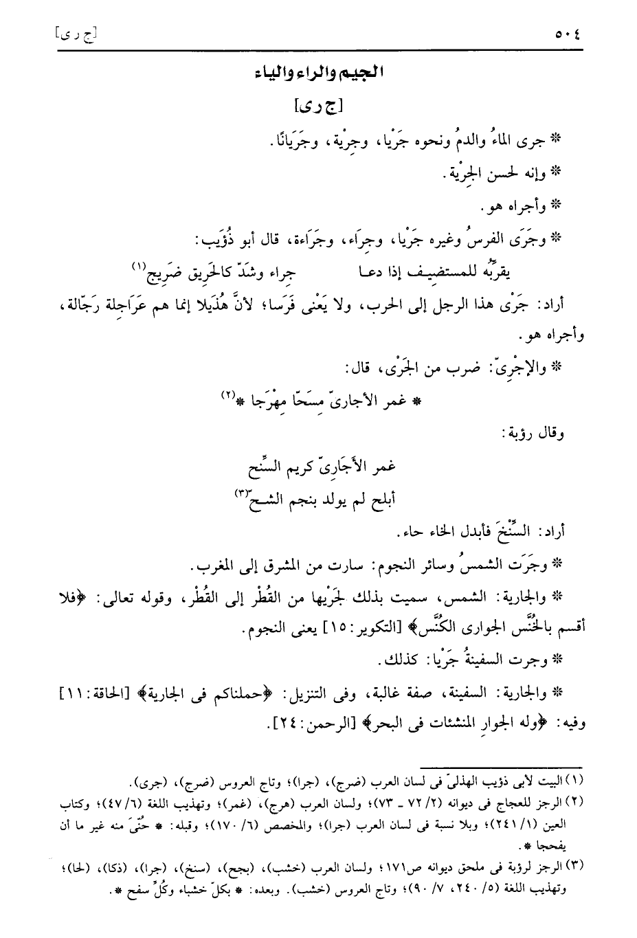 وجَرَى الْفرس وَغَيره جَرْيا، وجِرَاء، وجَرَاءة، قَالَ أَبُو ذُؤَيْب: