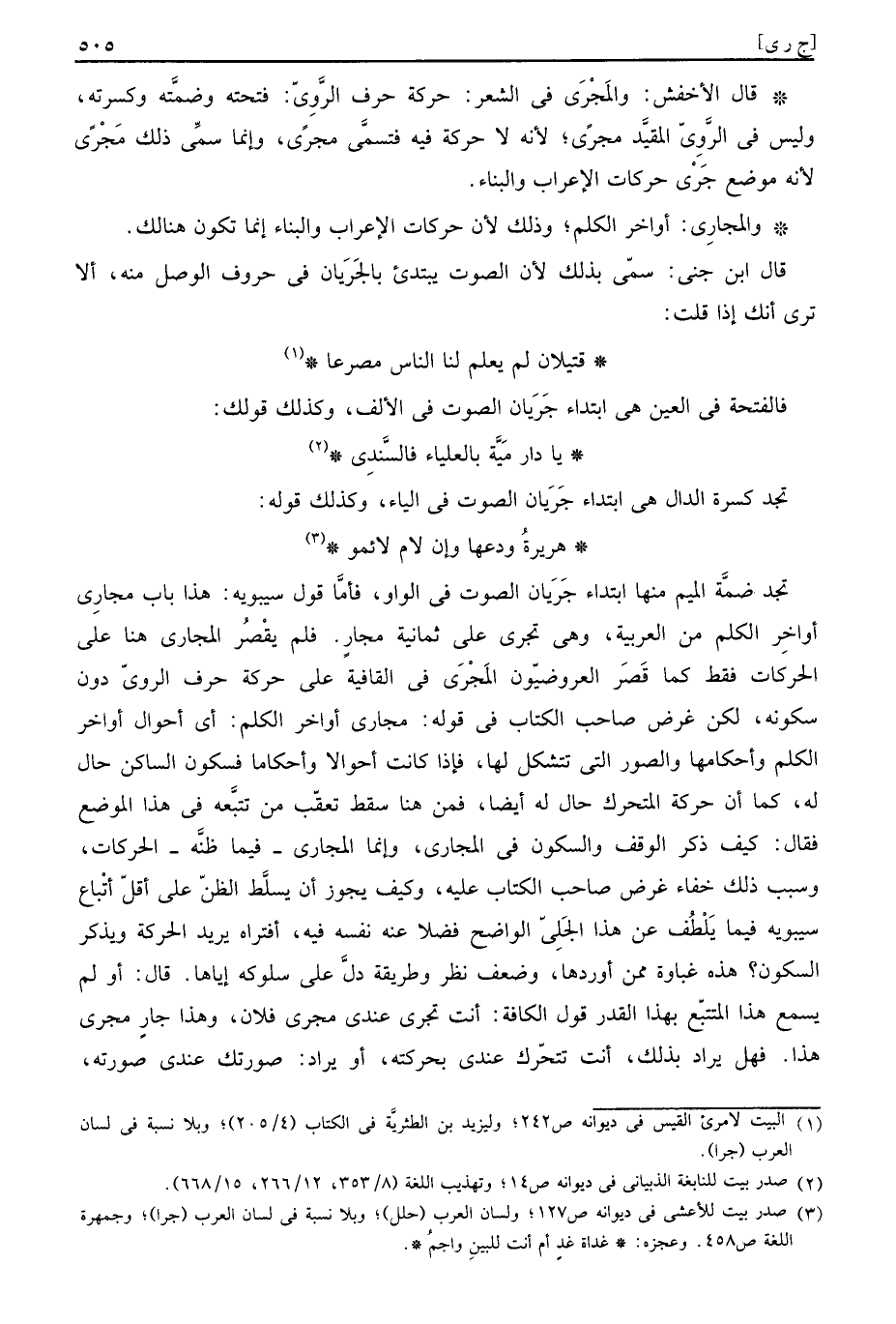 تَجِد ضمة الْمِيم مِنْهَا ابْتِدَاء جَرَيَان الصَّوْت فِي الْوَاو، فَأَما قَول سِيبَوَيْهٍ: هَذَا بَاب مجاري أَوَاخِر الْكَلم من الْعَرَبيَّة، وَهِي تجْرِي على ثَمَانِيَة مجارٍ، فَلم يقصر المجاري هُنَا على الحركات فَقَط كَمَا قصر العروضيون المجرى فِي القافية على حَرَكَة حرف الروى دون سكونه، لَكِن غَرَض صَاحب الْكتاب فِي قَوْله: مجاري أَوَاخِر الْكَلم: أَي أَحْوَال أَوَاخِر الْكَلم وأحكامها والصور الَّتِي تتشكل لَهَا، فَإِذا كَانَت أحوالا وأحكاما فَسُكُون السَّاكِن حَال لَهُ، كَمَا أَن حَرَكَة المتحرك حَال لَهُ أَيْضا، فَمن هُنَا سقط تعقب من تتبعه فِي هَذَا الْموضع فَقَالَ: كَيفَ ذكر الْوَقْف والسكون فِي المجاري، وَإِنَّمَا المجاري، فِيمَا ظَنّه، الحركات، وَسبب ذَلِك خَفَاء غَرَض صَاحب الْكتاب عَلَيْهِ، وَكَيف يجوز أَن يُسَلط الظَّن على اقل أَتبَاع سِيبَوَيْهٍ فِيمَا يلطف عَن هَذَا الْجَلِيّ الْوَاضِح فضلا عَنهُ نَفسه فِيهِ، أفتراه يُرِيد الْحَرَكَة وَيذكر السّكُون؟ هَذِه غباوة مِمَّن أوردهَا، وَضعف نظر وَطَرِيقَة دلّ على سلوكه إِيَّاهَا. قَالَ: أَو لم يسمع هَذَا المتتبع بِهَذَا الْقدر قَول الكافة: أَنْت تجْرِي عِنْدِي مجْرى فلَان، وَهَذَا جَار مجْرى هَذَا. فَهَل يُرَاد بذلك، أَنْت تتحرك عِنْدِي بحركته، أَو يُرَاد: صُورَتك عِنْدِي صورته،