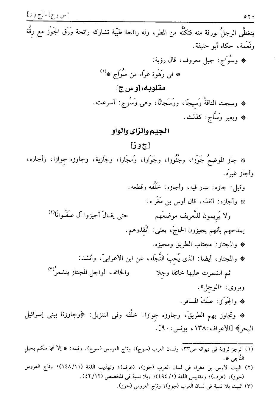 جَازَ الْموضع جَوْزا، وجُئُوزا، وجَوَازا، ومَجَازا، وجازية، وجاوزه جِوازا، وَأَجَازَهُ، وَأَجَازَ غَيره.