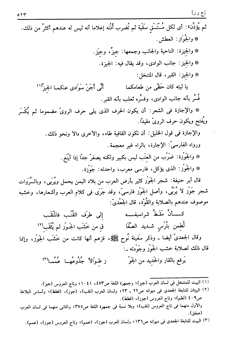 قَالَ أَبُو حنيفَة: شجر الجَوْز كثير بِأَرْض الْعَرَب من بِلَاد الْيمن يحمل ويربى، وبالسروات شجر جَوْز لَا يربى، وأصل الْجَوْز فَارسي، وَقد جرى فِي كَلَام الْعَرَب واشعارها، وخشبه مَوْصُوف عِنْدهم بالصلابة وَالْقُوَّة، قَالَ الْجَعْدِي: