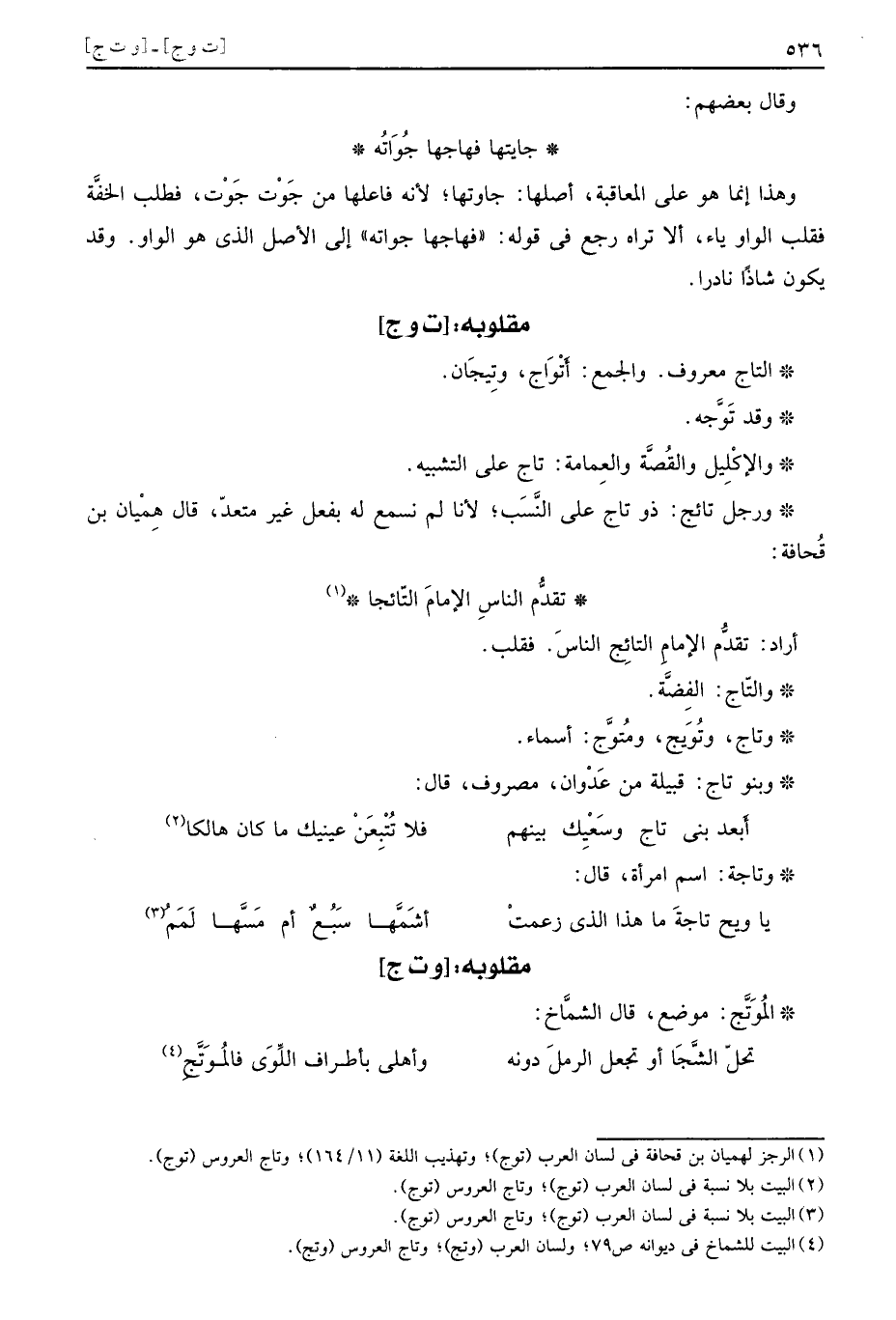 وَرجل تائج: ذُو تَاج على النّسَب؛ لأَنا لم نسْمع لَهُ بِفعل غير مُتَعَدٍّ، قَالَ هميان بن قُحَافَة: