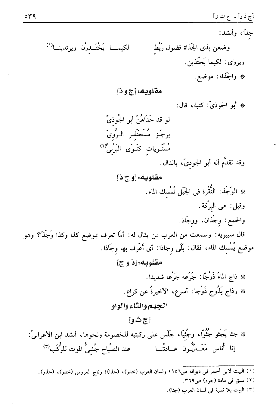 قَالَ سِيبَوَيْهٍ: وَسمعت من الْعَرَب من يُقَال لَهُ: أما تعرف بِموضع كَذَا وَكَذَا وجْذاً؟ وَهُوَ مَوضِع يمسك المَاء، فَقَالَ: بلَى وِجاذا: أَي أعف بهَا وِجَاذا.