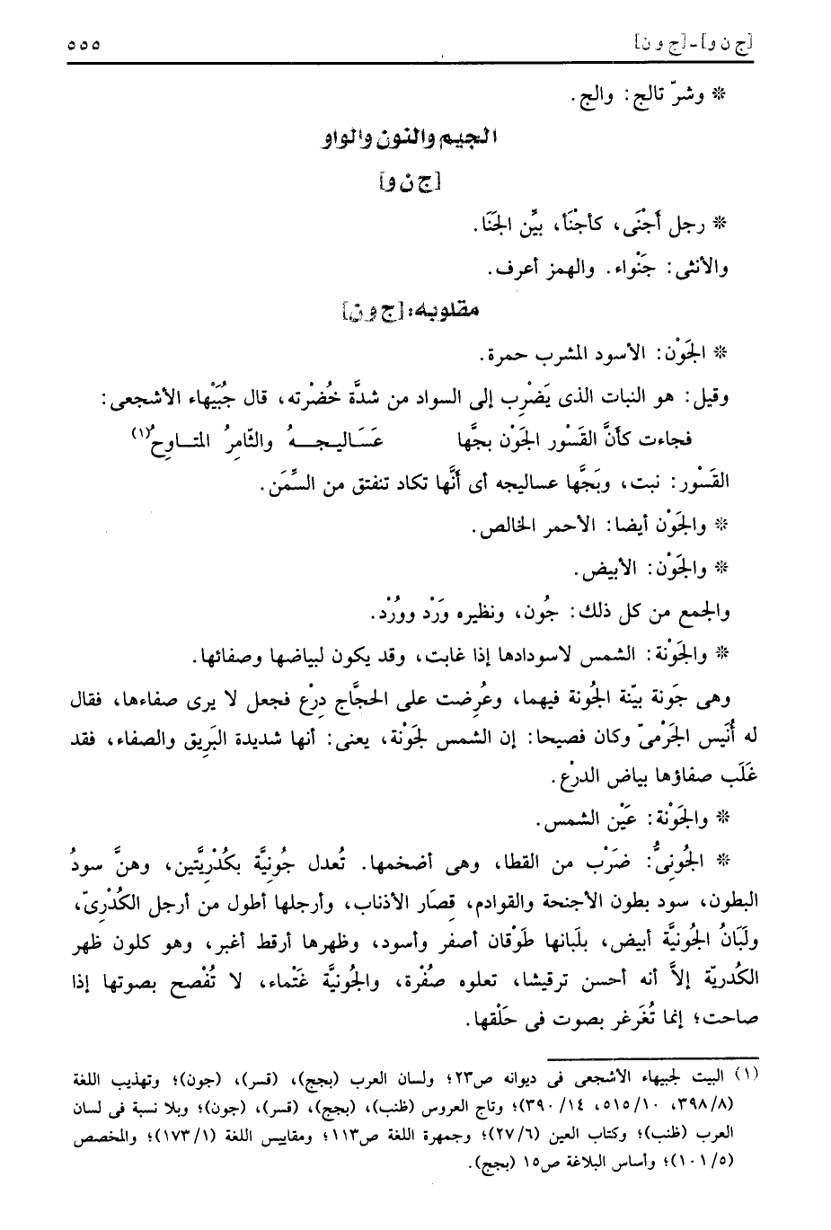 وَهِي جَونة بَيِّنَة الجُونة فيهمَا، وَعرضت على الْحجَّاج درع فَجعل لَا يرى صفاءها، فَقَالَ لَهُ أنيس الْجرْمِي وَكَانَ فصيحا: إِن الشَّمْس لَجْونة، يَعْنِي: أَنَّهَا شَدِيدَة البريق والصفاء، فقد غلب صفاؤه بَيَاض الدرْع.